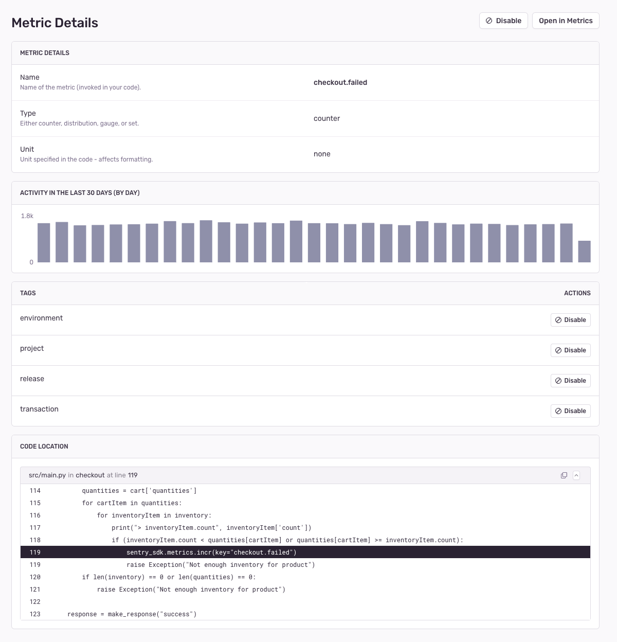 Team Admins and users with Manager or Owner privileges within your organization also have the ability disable a metric by clicking on "Disable". This will block the further ingestion of a metric and make it inaccessible in Metrics, Alerts and Dashboards. This can be useful when a metric is no longer desired or has been misconfigured, but it's not immediately possible to stop emitting it on all clients.