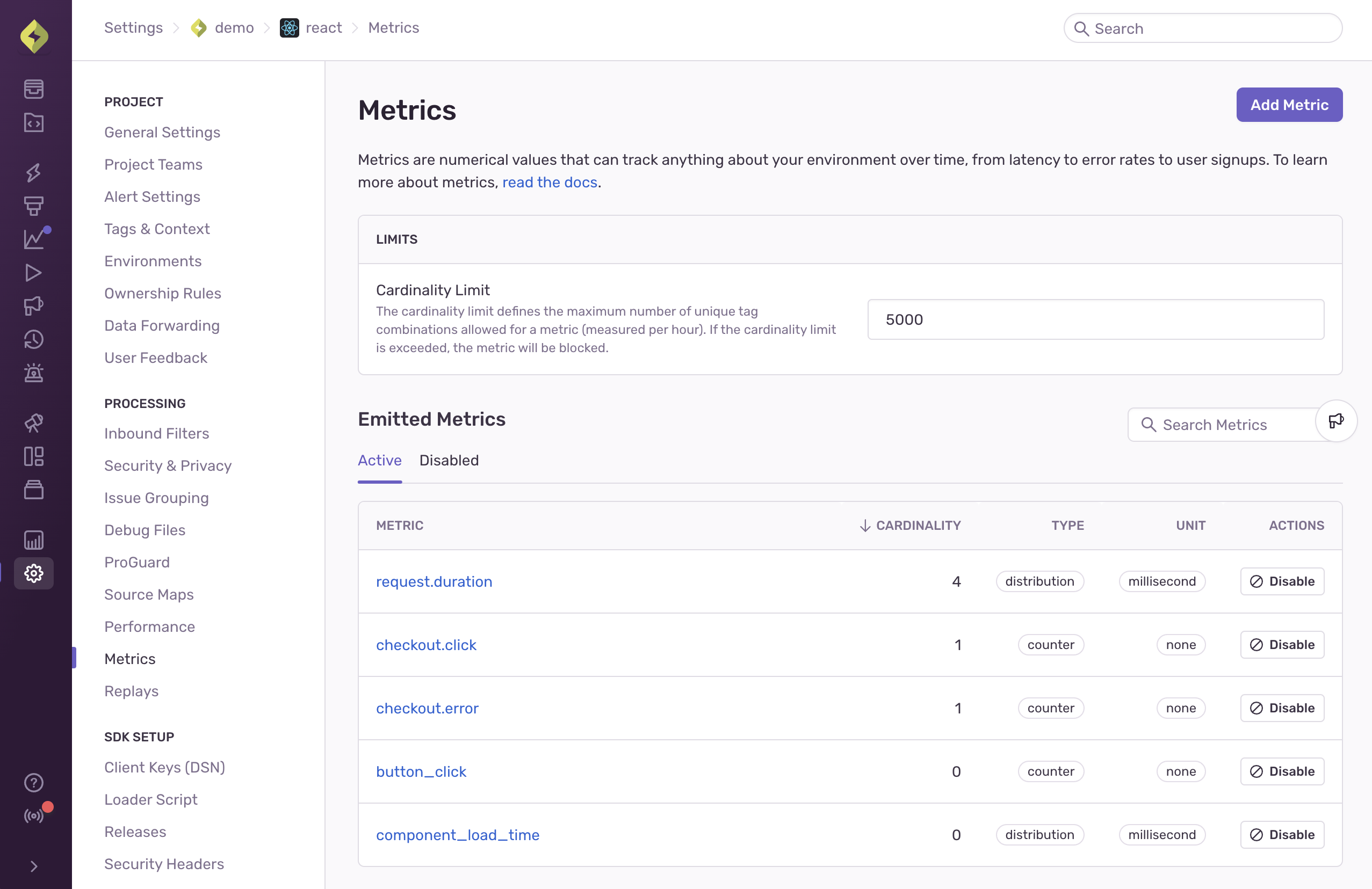 The Metrics settings page allows you to see and manage the metrics emitted within a project all in one place. You can access it by navigating to your project settings and selecting Metrics from the left sidebar.